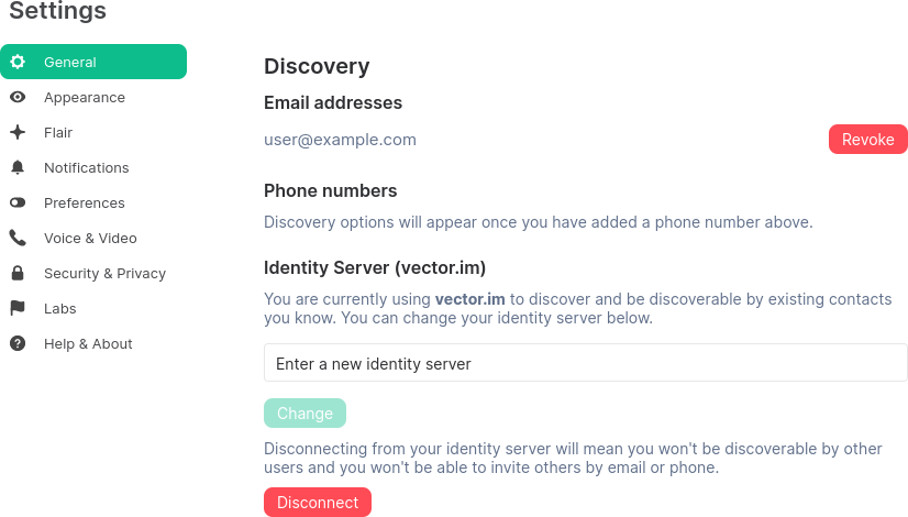 By default, there is no public link between your Matrix account and any identifying information such as your email address. However, you may wish people to be able to find your Matrix ID by looking up your email address or phone number. We also have plans to add additional functionality to our bots if they are able to look up contributors by email addresses. If you wish to make your account discoverable in this way, you may perform the following steps to list your account in one of the public third-party identifier services. Note that these services are designed to only return results for someone who already knows your email address or phone number; they take care to ensure that it is not possible (or nearly so) to “scrape” their data sets to obtain lists of users.